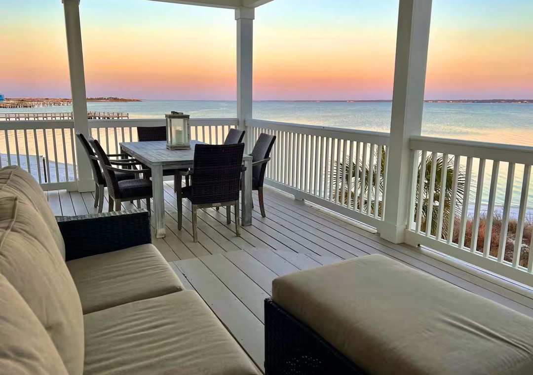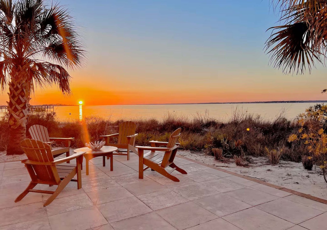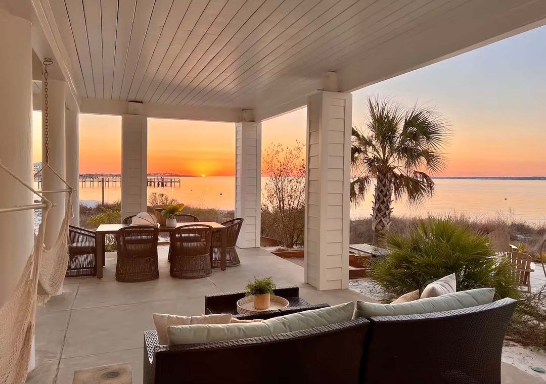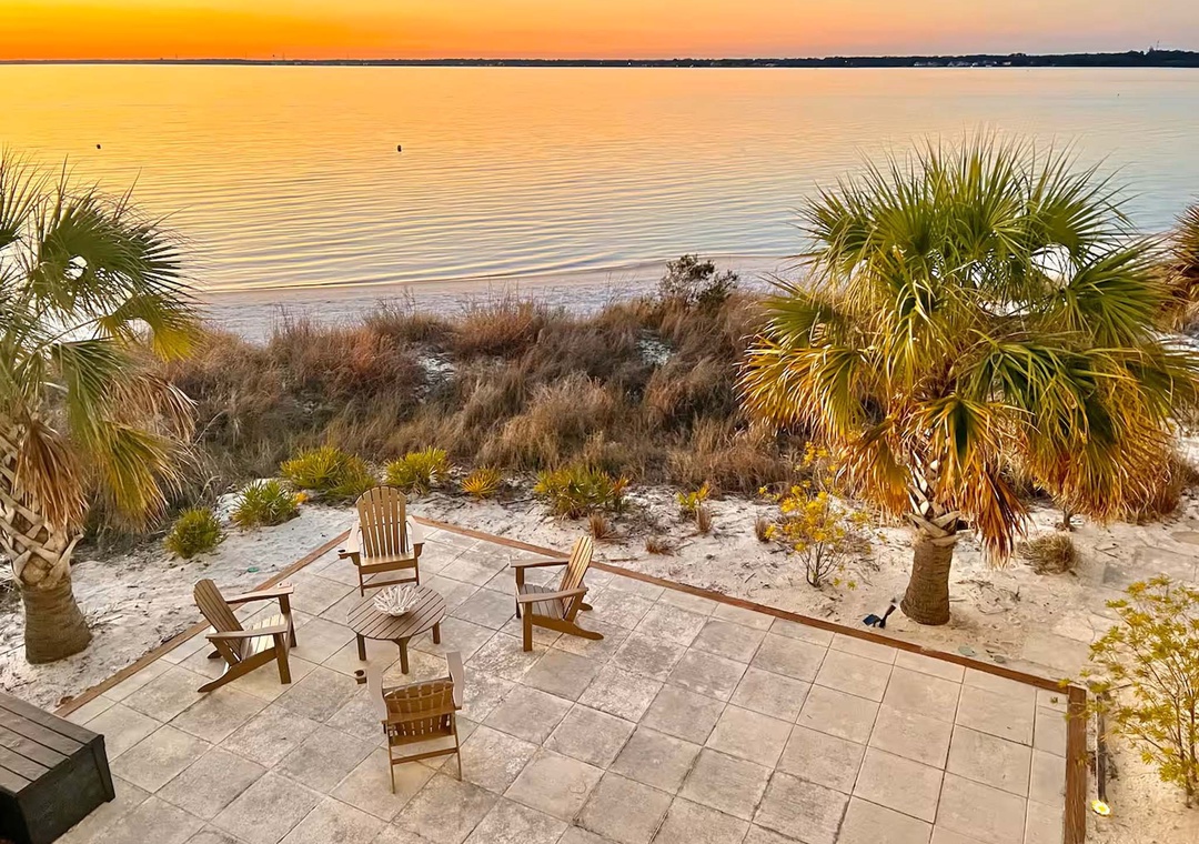 Stunning private waterfront home with 360 water views and relaxing outdoor living decks or your backyard beach. Professionally renovated and designed in 30A style furnishings with views of water all over the home. Let the soothing waves from the enchanting backyard take you away on your island retreat. This home is on a barrier island in the gated Navarre Beach community on the calmer, child friendly waters of the Santa Rosa Sound and a short walk/bike from the turquoise waters of the Gulf. This beautiful home sleeps 10 guests comfortably with two master suites with king beds and ensuites, a guest bedroom with a king bed, and a guest bedroom with a twin-over-twin bunk, a twin bed, and a twin trundle. You will find 1,250 sq ft of covered decks/veranda, fully furnished for those amazing sunsets and sunrises, a ground-level bar, side-by-side refrigerator and grill for outdoor use, a rare spacious ground-level bathroom with private indoor heated shower, and additional outdoor shower for post-beach clean up, a private water/sunset view office with private balcony for working from home, and much more! Book a memorable vacation stay today at Pearl Hideaway and get ready for the stay of a lifetime!
