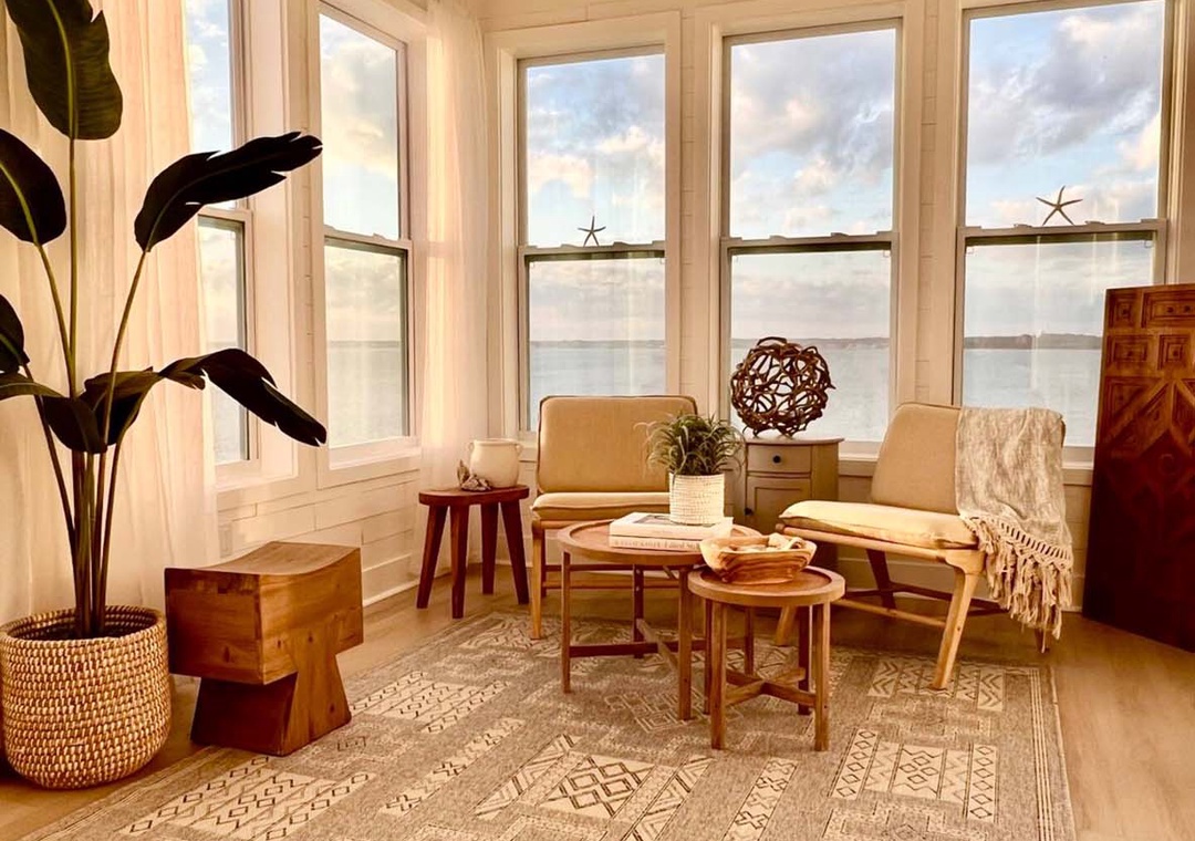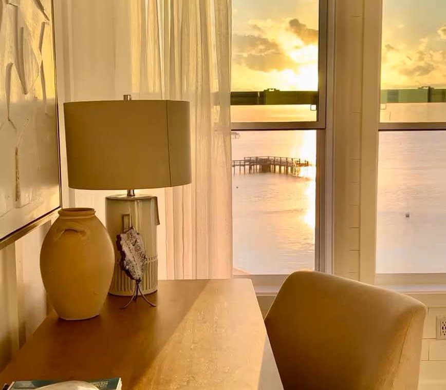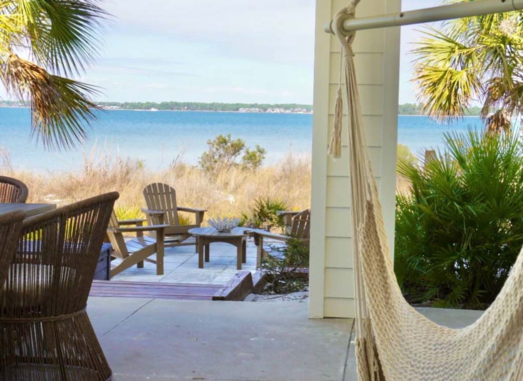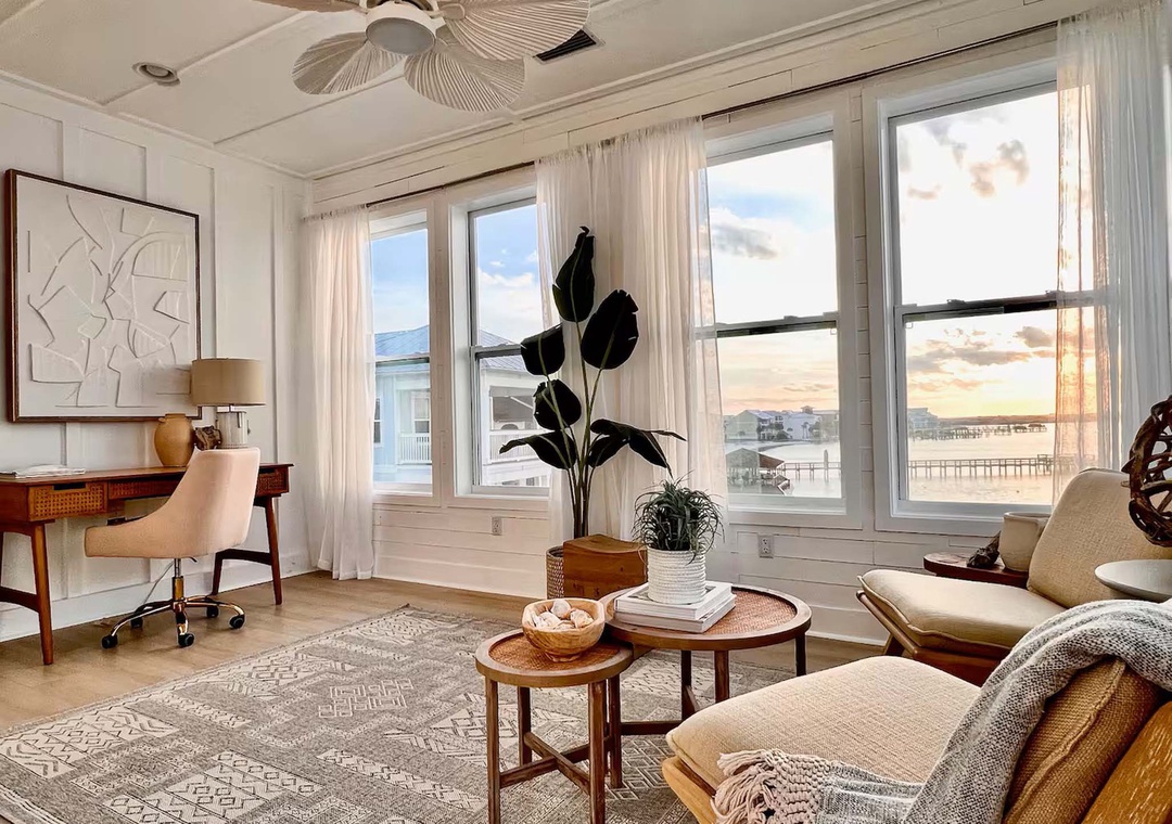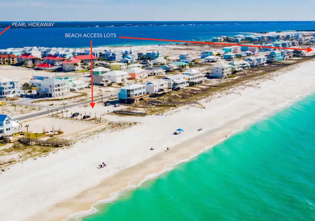 Stunning private waterfront home with 360 water views and relaxing outdoor living decks or your backyard beach. Professionally renovated and designed in 30A style furnishings with views of water all over the home. Let the soothing waves from the enchanting backyard take you away on your island retreat. This home is on a barrier island in the gated Navarre Beach community on the calmer, child friendly waters of the Santa Rosa Sound and a short walk/bike from the turquoise waters of the Gulf. This beautiful home sleeps 10 guests comfortably with two master suites with king beds and ensuites, a guest bedroom with a king bed, and a guest bedroom with a twin-over-twin bunk, a twin bed, and a twin trundle. You will find 1,250 sq ft of covered decks/veranda, fully furnished for those amazing sunsets and sunrises, a ground-level bar, side-by-side refrigerator and grill for outdoor use, a rare spacious ground-level bathroom with private indoor heated shower, and additional outdoor shower for post-beach clean up, a private water/sunset view office with private balcony for working from home, and much more! Book a memorable vacation stay today at Pearl Hideaway and get ready for the stay of a lifetime!