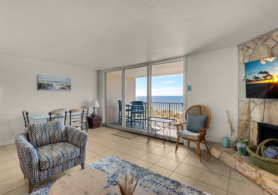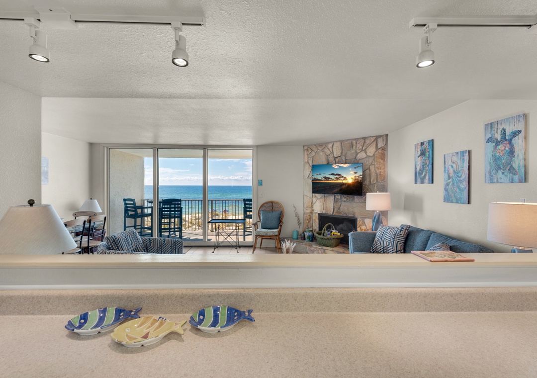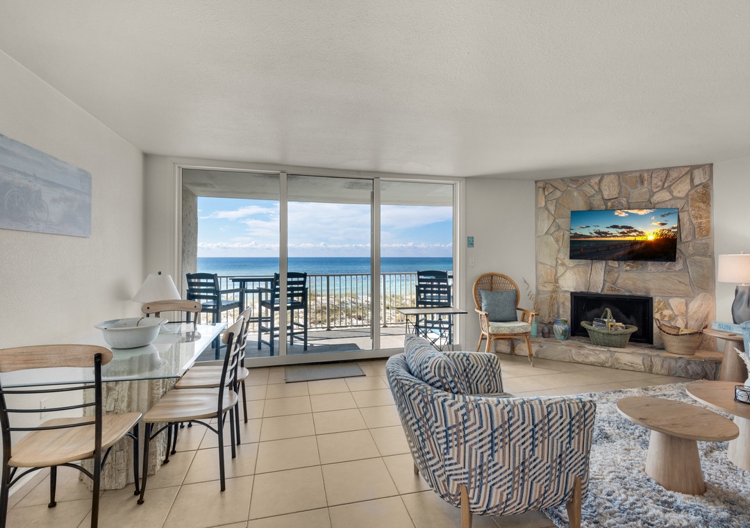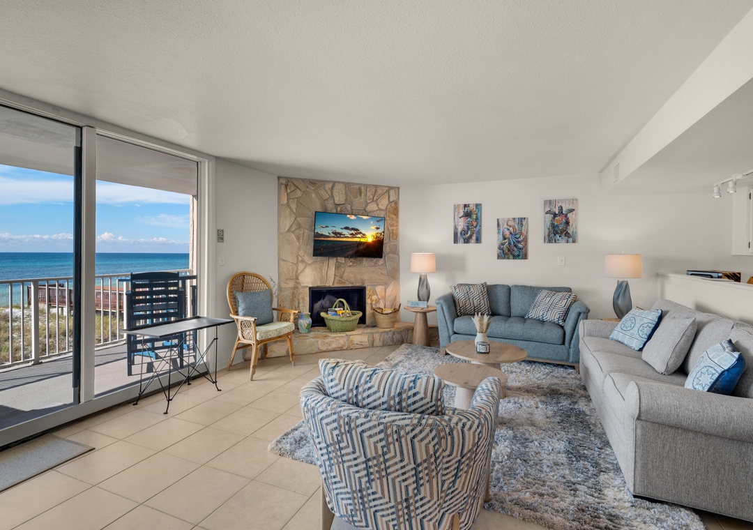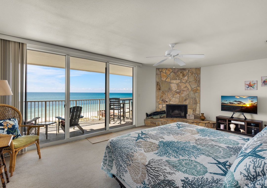 Starboard Village 423 is a lovely two bedroom, two and a half bath Condo which sits directly on Pensacola Beach. The ground level features a garage with two covered spaces. When you enter this beautiful condo, you’ll notice the tile flooring, gulf views, fireplace and and flatscreen Tv in the living room. The glass sliders open out to the beachfront balcony! The kitchen is open to the living room and is light and bright. The dining table seats 4 and is positioned for you to enjoy the views of the beach and there’s a half bath on this level. Going upstairs, you’ll find the beach front king master suite with a beach front balcony and fireplace and a queen bedroom suite. With an additional sleeper in the living room, this property sleeps up to 6 guests. Enjoy washer and dryer and free Wifi. Note that there’s no elevator here, it is 28 steps to the front door. Make your next vacation memory at Starboard Village 423!