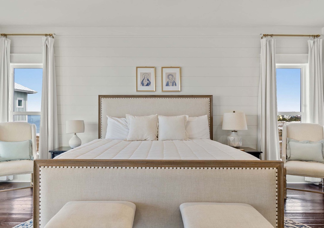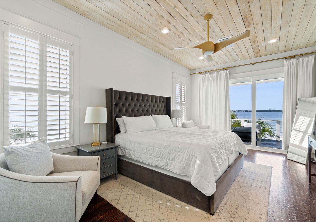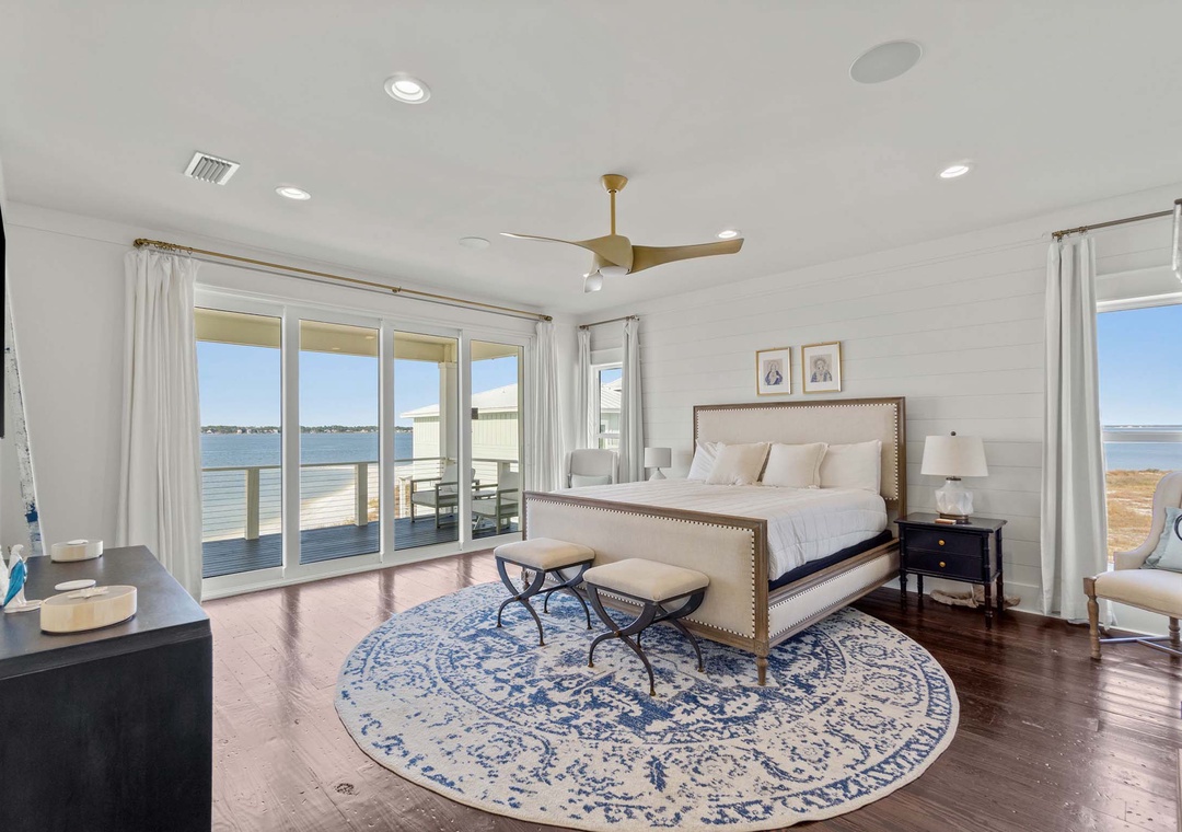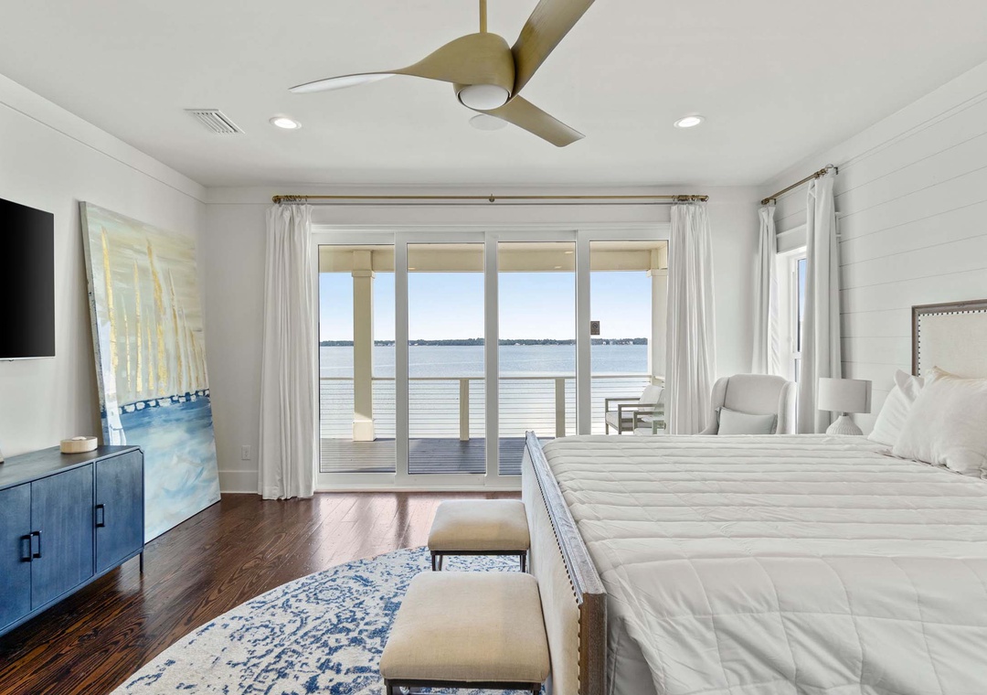 • Master Suite 1: King bed, spa-style en-suite bath, soaking tub, private balcony & water views